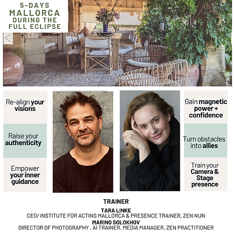 Heat, Summer, Mallorca. On the 12th of August 2026 the 100% Sun Eclipse passes right above our island! We decided to invite friends, tribe members, creatives souls and champions who work with people or work in the public eye. You´ll be spending a 5-day summer workation in Mallorca to witness this unique power of nature moment, to work on your own ideas & projects, but also to get a daily input: -realign your vision -reconnect with your inner leadership - step into visible, embodied presence — on and off camera. This is a space to think, create and reposition — with guidance, structure and real output. A setting designed for clarity, momentum and meaningful visibility. A summer reset for your voice, your vision and your visibility. Not a retreat from your work — but a return to it with direction. The actress and heart of I.AM, Tara Linke, trains speakers, coaches and entrepreneurs in Presence & Performance since 2015. For this workshop she will be accompanied by Nadja Bontscheff (Systemic Councelling), Elke Höllmann (Buddhist Psychology & Tibetan Healing Yoga) and Marino Solokhov (Camera Presence / About Me Video). SCHEDULE: August 11 - Arrival day from 18:00 welcoming aperitif with dinner 19:30-21:30 Workshop phase 1 August 12 - Eclipse Day 10:00-14:30 - Workshop phase 1 15:45 - 16:45 - Drive to harbor 17:30-21:30 - Sailing Boat Tour with Tapas / Eclipse around 20:00 (max. 12 people) August 13 10:00-16:00 - Workshop phase 2 August 14 10:00-16:00 - Workshop phase 3 August 15 10:00-16:00 - Workshop phase 4 August 16 - Departure day Leaving around 11am to Palma and Airport FEE 695,-€ + 21% VAT 895€ + 21% VAT (with sailing tour) ACCOMMODATION: 155€ Single Regular (shared bath) 200€ Single De Luxe (bigger space, bath en suite) Twin Room: 50% (If available. We´ll pair you up, if you come alone) CATERING: 55€ / day include 3 meals per day + all snacks + Water/tea/coffee/juice. Intolerances will be respected. If we all decide to eat out in a restaurant, everyone pays their share. VILLA / LOCATION: close to Son Severa (45mins from Airport, 55 mins from Palma center) GETTING THERE: SHUTTLE: Arrival day shuttle hours: 10am-8pm (possible waiting time of 1 hr possible) / Departure day: 10am to Airport + Palma Center. Shuttle: 30€ per way. TAXI: 45mins / around 100€ per way OPTIONAL: Editing of the About Me Video by Marino can be requested through us.